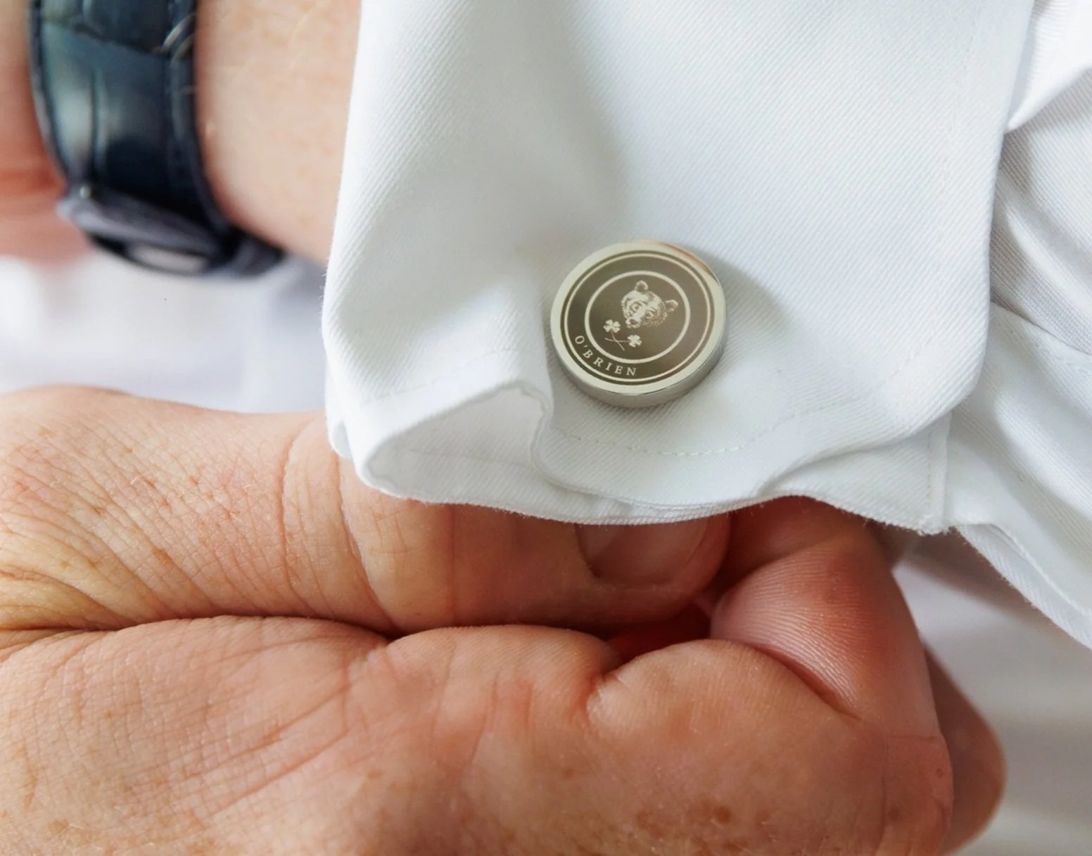 I designed a crest for this couple's wedding, featuring illustrated elements and their last name to use on various items throughout their special day. The crest was further customized for engraving on the groom’s cufflinks and for a printing a custom vinyl record as a personal keepsake from the big day.